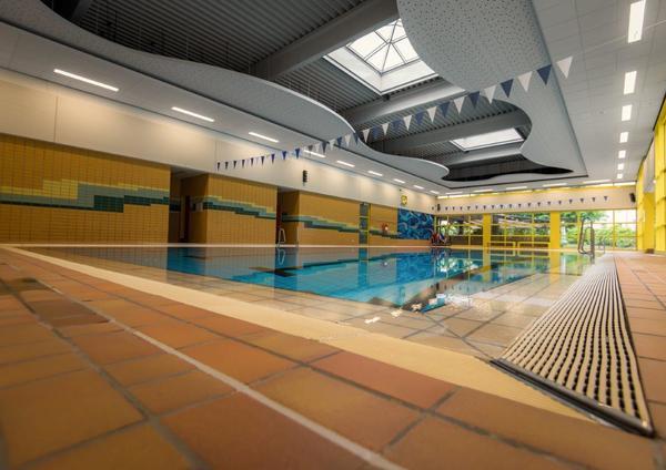 Während der letzte Besuch der FU in der Geschäftsstelle der enewa am Wachtbergring stattfand, begrüßen die Geschäftsführer Jörg Ostermann und Kai Birkner ihre Gäste diesmal am Ort ihres neuen Geschäftsfeldes, dem Bäderbetrieb im Hallenbad Wachtberg.